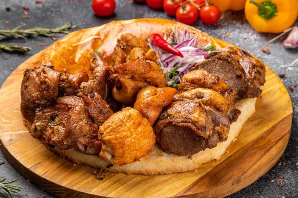 Свиная шейка (1 шт., 300 г), бедро куриное (1 шт., 300 г), телятина с чабрецом (1 шт., 300 г), лук, зелень (100 г), соус шашлычный (100 г), лепешка (1 шт., 300 г)
