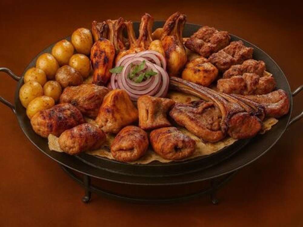 Корейка баранья (300 г), люля-кебаб из баранины (280 г), бедро куриное (280 г), люля-кебаб из курицы (280 г), бедро куриное (280 г), люля из курицы (280 г), голень куриная (300 г), картофель молодой (400 г), лук и зелень (200 г), соус шашлычный (200 г), соус тартар (200 г)