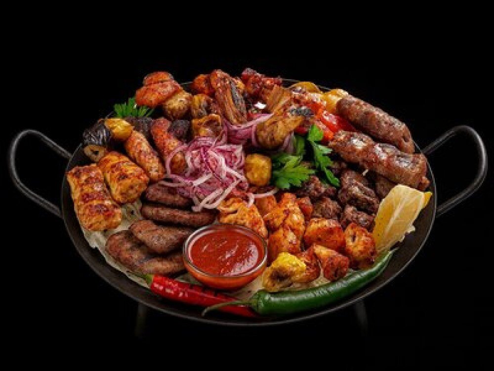 Грудка куриная (560 гр), телятина с чабрецом (560 гр), шейка свиная (560 гр), ребра свиные (600 гр), люля-кебаб из говядины (560 гр), люля-кебаб из курицы (560 гр), овощи на гриле (помидоры, баклажаны, перец болгарский 800 гр), соус шашлычный (200 гр), лук и зелень (200 гр)