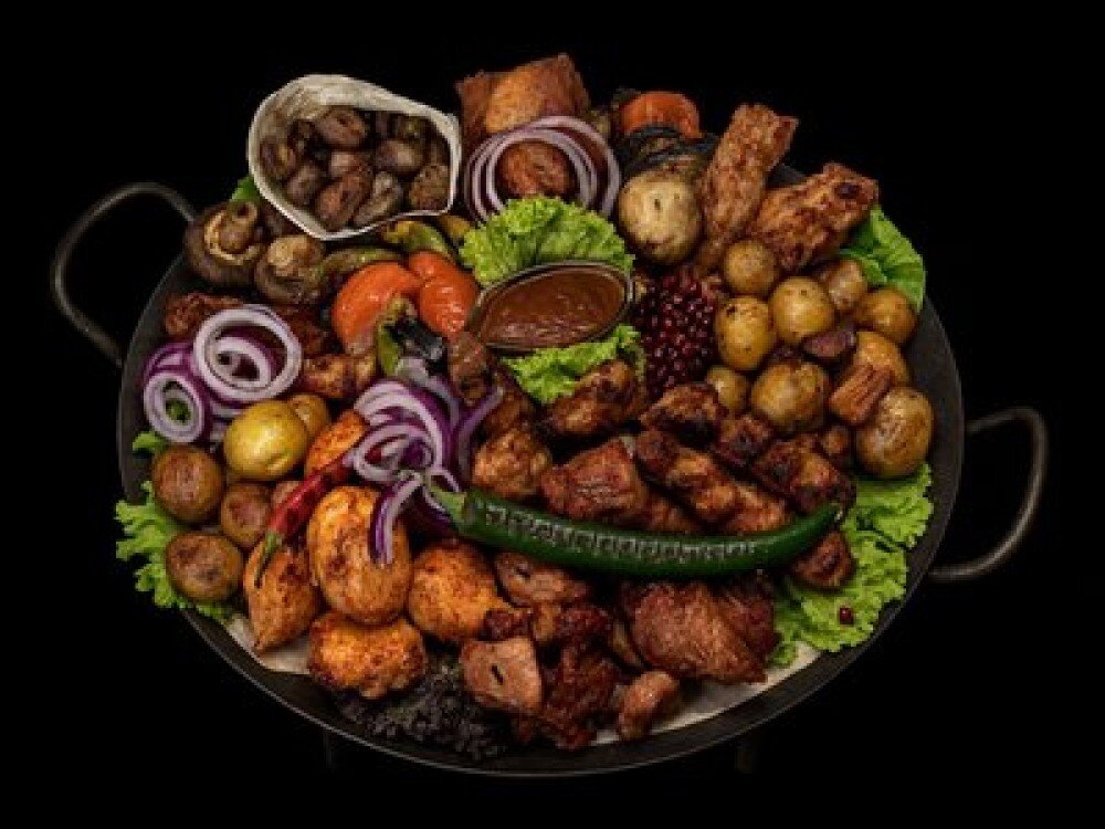 Шейка свиная (560 г), мякоть свиная (560 г), бедро куриное (560 г), голень куриная (560 г), телятина с чабрецом (560 г), мякоть баранья (560 г), шампиньоны (400 г), картофель молодой (600 г), овощи на гриле (помидоры, баклажан, болгарский перец) (800 г), лук и зелень (200 г), соус шашлычный (400 г)