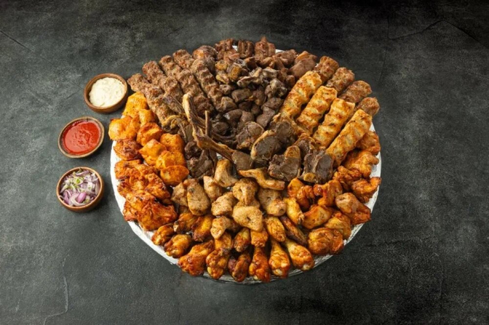 Корейка баранья (600 г), бедро куриное (560 г), телятина маринованная (560 г), грудка куриная (560 г), мякоть баранья (560 г), люля-кебаб из говядины (560 г), люля-кебаб из курицы (560 г), люля-кебаб из баранины (560 г), лук и зелень (200 г), соус шашлычный (300 г), соус тартар (300 г)