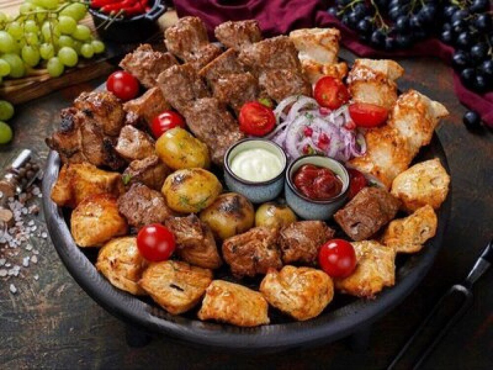 Шейка свиная (280 г), мякоть свиная (280 г), бедро куриное (280 г), грудка куриная (280 г), мякоть баранья (280 г), люля-кебаб из говядины (560 г), люля-кебаб из курицы (560 г), помидоры на углях (300 г), картофель молодой (400 г), лук и зелень (200 г), соус шашлычный (200 г), соус тартар (200 г)