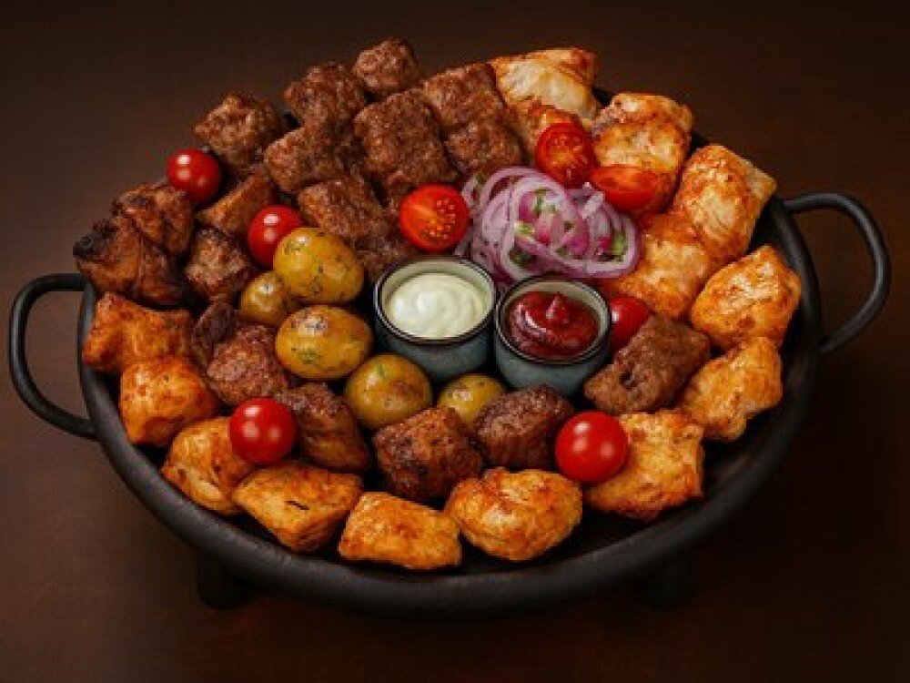 Шейка свиная (560 г), бедро куриное (560 г), мякоть свиная (560 г), мякоть баранья (560 г), картофель молодой (400 г), помидоры на углях (300 г), соус шашлычный (150 г), соус тартар (150 г), лук, зелень (150 г)