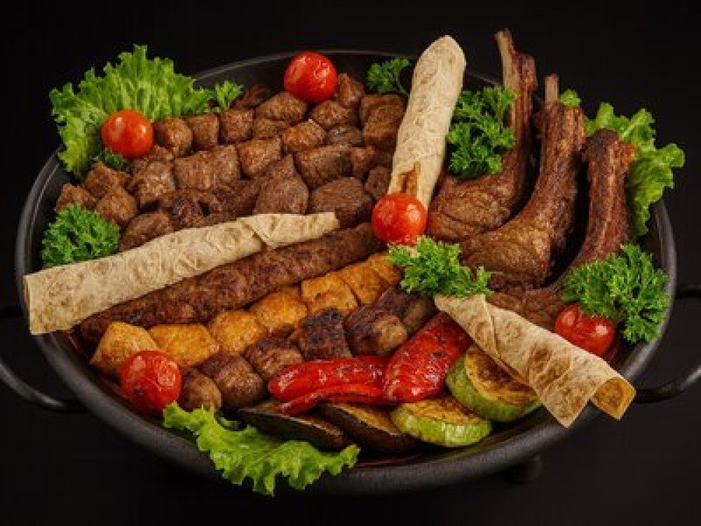 Корейка баранья (300 г), мякоть барашка (280 г), телятина с чабрецом (280 г), шейка свиная (280 г), бедро куриное (280 г), картофель (300 г), овощи на гриле ( помидоры, баклажан, болгарский перец - 600 г), лук, зелень (200 г), соус (200 г)