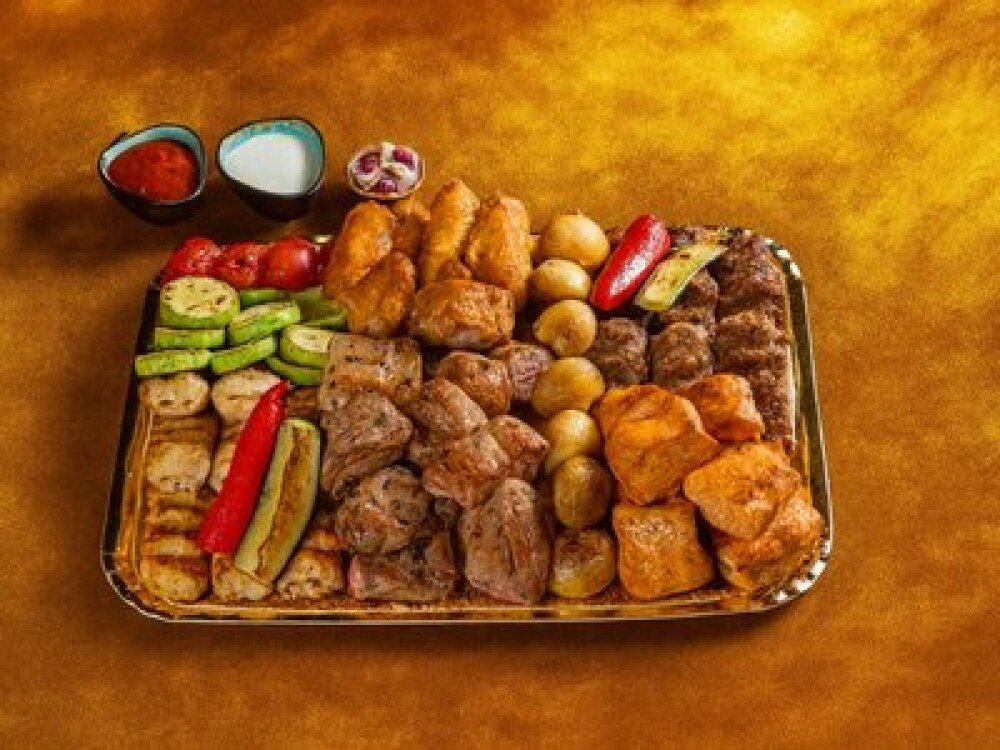 Люля-кебаб из говядины (2 порции; 560 г), телятина (2 порции; 560 г), крылья куриные (1 порция; 300 г), бедро куриное (1 порция; 280 г), шейка свиная (2 порции; 560 г), мякоть свиная (2 порция; 560 г), картофель молодой (600 г), овощи на гриле (помидоры, баклажаны, перцы болгарские; 800 г), лук и зелень (200 г), соус тартар (200 г), соус шашлычный (200 г)