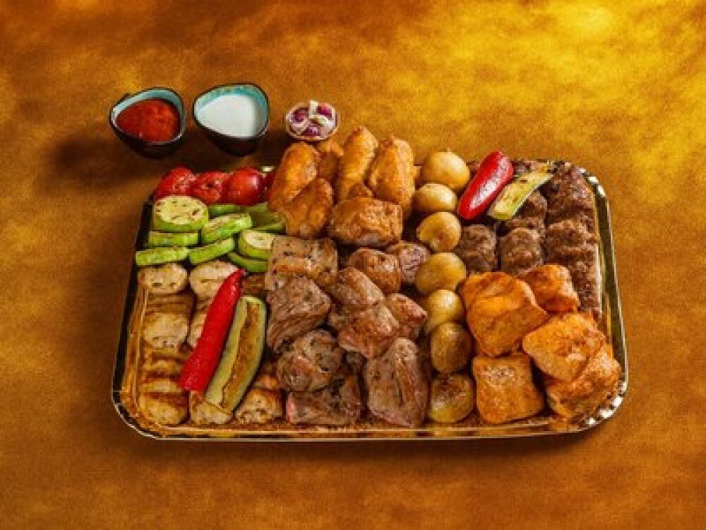 Крылья куриные (1 порция; 300 г), бедро куриное (1 порция; 280 г), люля-кебаб из курицы (1 порция; 280 г), люля-кебаб из говядины (1 порция; 280 г), мякоть баранья (1 порция; 280 г), семечки бараньи (1 порция; 280 г), телятина (2 порции; 560 г), шейка свиная (2 порции; 560 г), мякоть свиная (1 порция; 280 г), овощи на гриле (помидоры, баклажаны, перцы болгарские; 500 г), картофель молодой (2 порции; 600 г), лук и зелень (200 г), соус шашлычный (200 г), соус тартар (200 г)