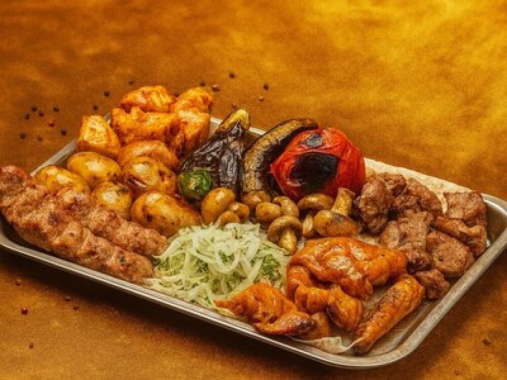 Голень куриная (1 порция; 280 г), бедро куриное (1 порция; 280 г), грудка куриная (1 порция; 280 г), семечки бараньи (1 порция; 280 г), мякоть баранья (1 порция; 280 г), люля-кебаб из баранины (1 порция; 280 г), телятина (2 порции; 560 г), картофель молодой (2 порции; 600 г), овощи на гриле (помидоры, баклажаны, перцы болгарские; 450 г), лук и зелень (200 г), шампиньоны (300 г), соус шашлычный (200 г)