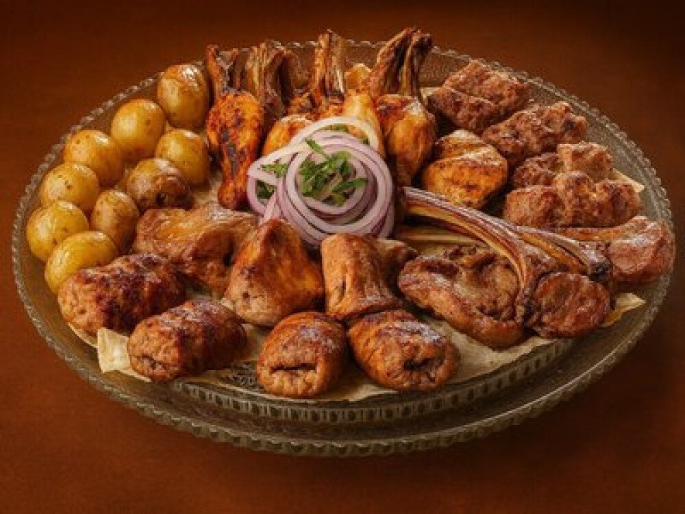 бедро куриное 280 г, шейка свиная 280 г, грудка куриная 280 г, корейка баранина 300 г, люля кебаб из баранины 280 г, люля кебаб из говядины 280 г, картофель молодой 600 г, лук зелень 150 г, соус для шашлыка 150 г
