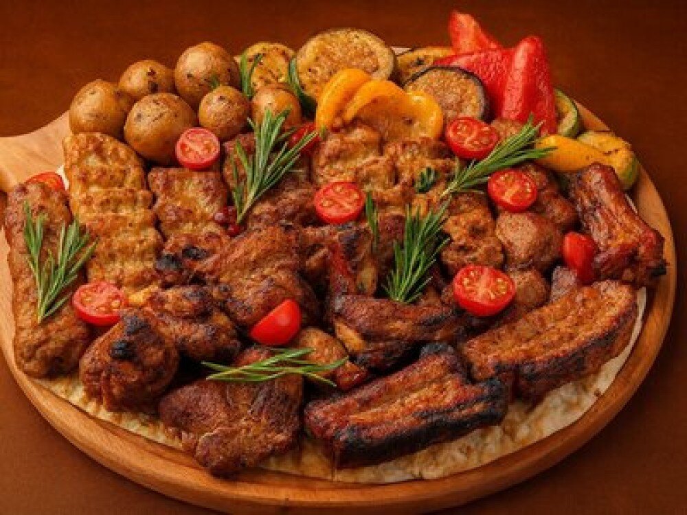 Ребра свиные 300 г, шейка свиная 280 г, бедро куриное 280 г, телятина с чабрецом 280 г, люля-кебаб из курицы 280 г, люля-кебаб из говядины 280 г, картофель молодой 300 г, овощи на гриле (баклажан, помидор, перец болгарский) 800 г
