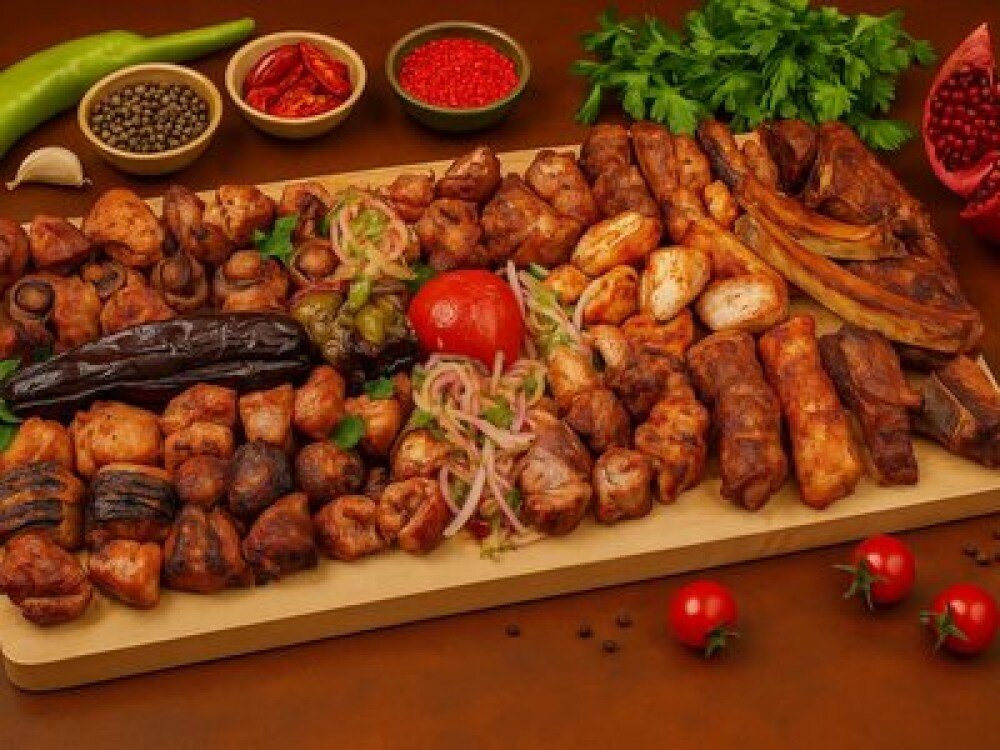 Корейка баранья (600 г), мякоть баранья (560 г), яблочко (баранина) (560 г), телятина с чабрецом (560 г), бедро куриное (560 г), грудка куриная (560 г), шейка свиная (560 г), мякоть свиная (560 г), овощи на гриле: помидоры, баклажаны, перец болгарский (800 г), шампиньоны (600 г), соус шашлычный (300 г), соус тартар (300 г), лук, зелень (200 г)
