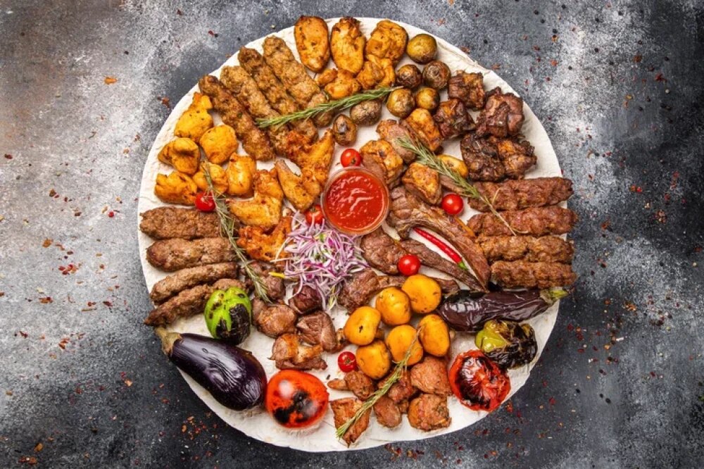 Бедро куриное (560 г), грудка куриная (560 г), корейка баранья (600 г), мякоть баранья (560 г), телятина маринованная (560 г), шейка свиная (560 г), мякоть свиная (560 г), крылья куриные (560 г), люля-кебаб из говядины (560 г), люля-кебаб из курицы (560 г), люля-кебаб из баранины (560 г), овощи на гриле (баклажаны, помидоры, болгарский перец - 1,2 кг), шампиньоны (600 г), картофель молодой (900 г), соус Тартар (500 г), соус шашлычный (500 г), лук и зелень (300 г)