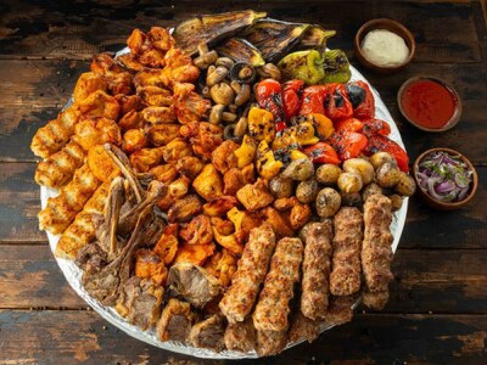 Свиная шейка (2 шт., 600 г), свиные ребра (2 шт., 600 г), филе куриного бедра (2 шт., 560 г), люля-кебаб из курицы (2 шт., 560 г), люля-кебаб из телятины (2 шт., 560 г), люля-кебаб из баранины (2 шт., 560 г), свиная мякоть (1 шт., 300 г), телятина с чабрецом (2 шт., 560 г), голень куриная (2 шт., 560 г), овощи на гриле: баклажан, помидор, перец (800 г), шампиньоны (600 г), лук и зелень (250 г), соус чесночный (300 г), соус шашлычный (300 г)