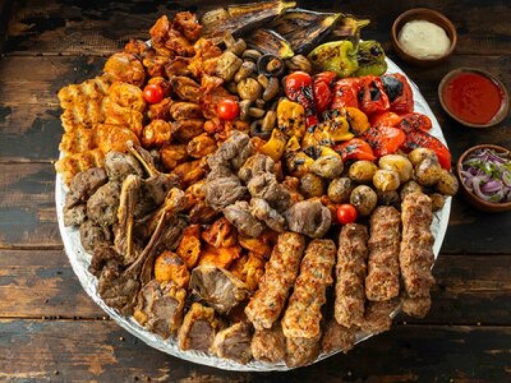 Люля-кебаб из свинины (2 шт.) (560 г), люля-кебаб из курицы (2 шт.) (560 г), люля-кебаб из телятины (2 шт.) (560 г), мякоть свиная (2 шт.) (560 г), бастурма из телятины (2 шт.) (560 г), свиные ребра (2 шт.) (600 г), филе куриной грудки (2 шт.) (560 г), филе куриного бедра (2 шт.) (560 г), крылья куриные (2 шт.) (560 г), голень куриная (2 шт.) (600 г), шампиньоны (400 г), овощи на гриле: помидор, перец, баклажан (1,2 кг), картофель молодой (1,2 кг), лук и зелень (250 г), соус шашлычный (300 г)