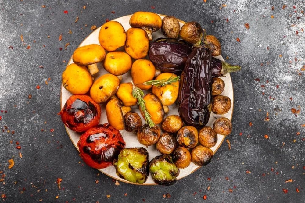 Овощи на гриле: баклажан, помидор, перец (2 шт.) (900 г), картофель молодой (500 г), шампиньоны на гриле (400 г), соус чесночный (100 г), соус шашлычный (100 г)