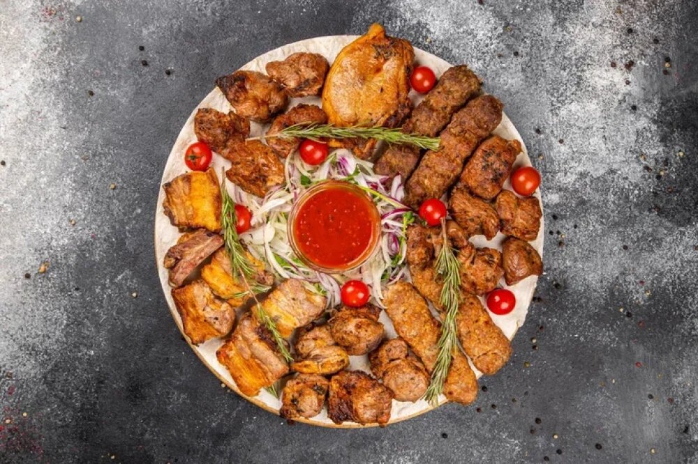 Люля-кебаб из телятины (2 шт., 560 г), люля-кебаб из свинины (2 шт., 560 г), свиная шейка (1 шт., 300 г), бастурма из телятины (1 шт., 280 г), свиные ребра (1 шт., 300 г), корейка ягненка (1 шт., 300 г), картофель молодой (2 шт., 500 г), лук, зелень (250 г), соус шашлычный (300 г)