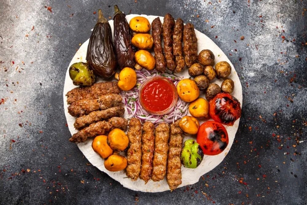 Люля-кебаб из говядины (2 порции, 560 г), люля-кебаб из курицы (2 порции, 560 г), люля-кебаб из баранины (2 порции, 560 г). Овощи на гриле (помидоры, баклажаны, болгарский перец, 800 г), шампиньоны (500 г), молодой картофель (600 г), лук и зелень (200 г), шашлычный соус (200 г), чесночный соус (200 г)