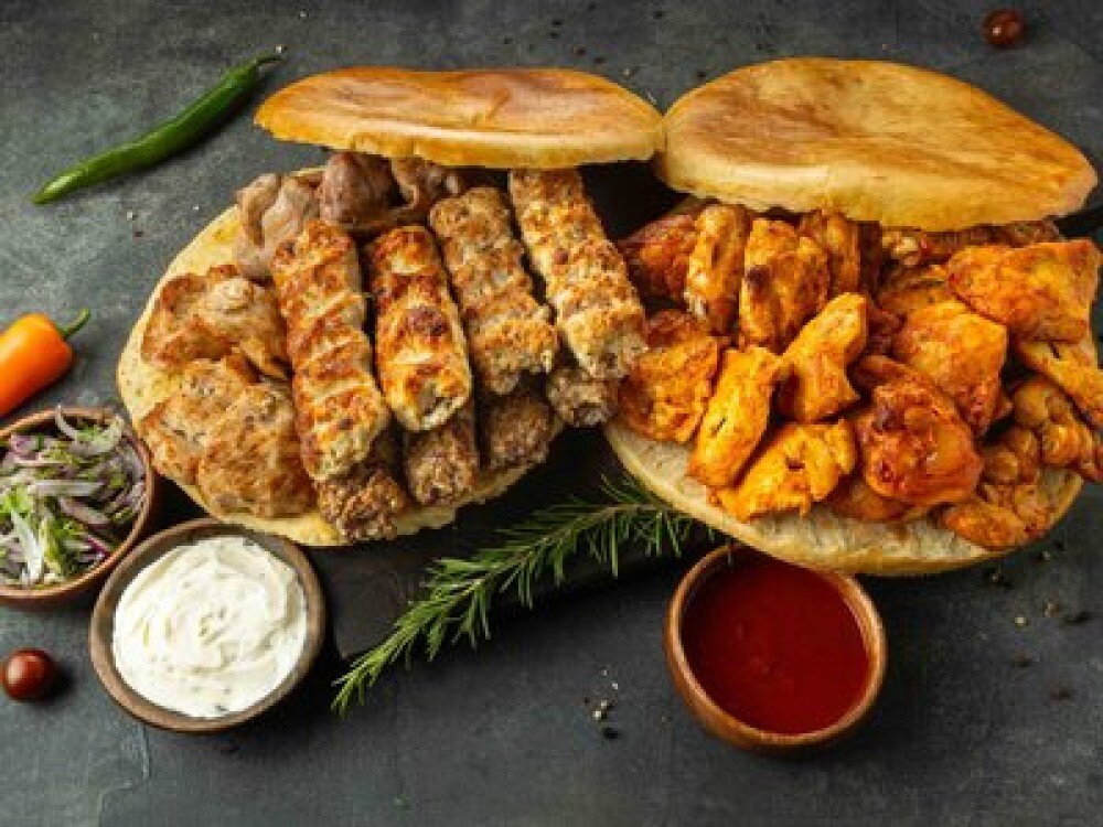 Свиная шейка(2 шт.) (560 г), люля-кебаб из свинины (2 шт.) (560 г), бедро куриное (2 шт.) (560 г), филе куриное (1 шт.) (280 г), крылья куриные (2 шт.) (560 г), соус чесночный (100 г), соус шашлычный (100 г), лук, зелень (100 г), лепешка (2 шт.) (по 400 г)