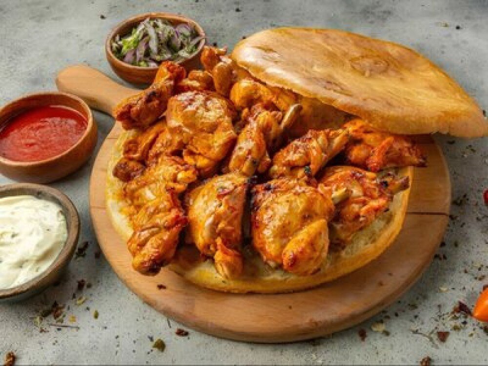 Бедро куриное (1 шт., 280 г), грудка куриная (1 шт., 280 г), голень куриная (1 шт., 280 г), крылья куриные (1 шт., 300 г), лук и зелень (100 г), соус тартар (100 г), соус шашлычный (100 г), лепешка тандырная (300 г).