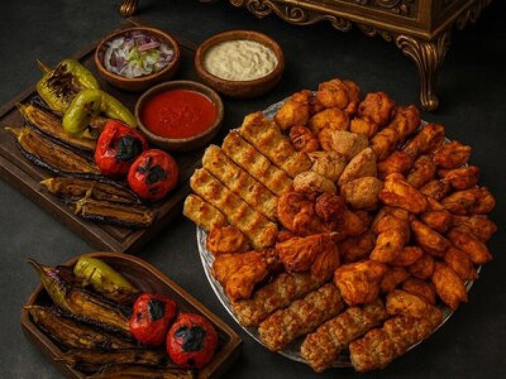 Бедро куриное (560 г), грудка куриная (560 г), крылья куриные (560 г), голень куриная (560 г), люля кебаб из курицы (560 г), овощи на гриле (помидоры, баклажан, болгарский перец (800 г)), лук и зелень (200 г), соус Тартар (200 г), соус шашлычный (200 г)
