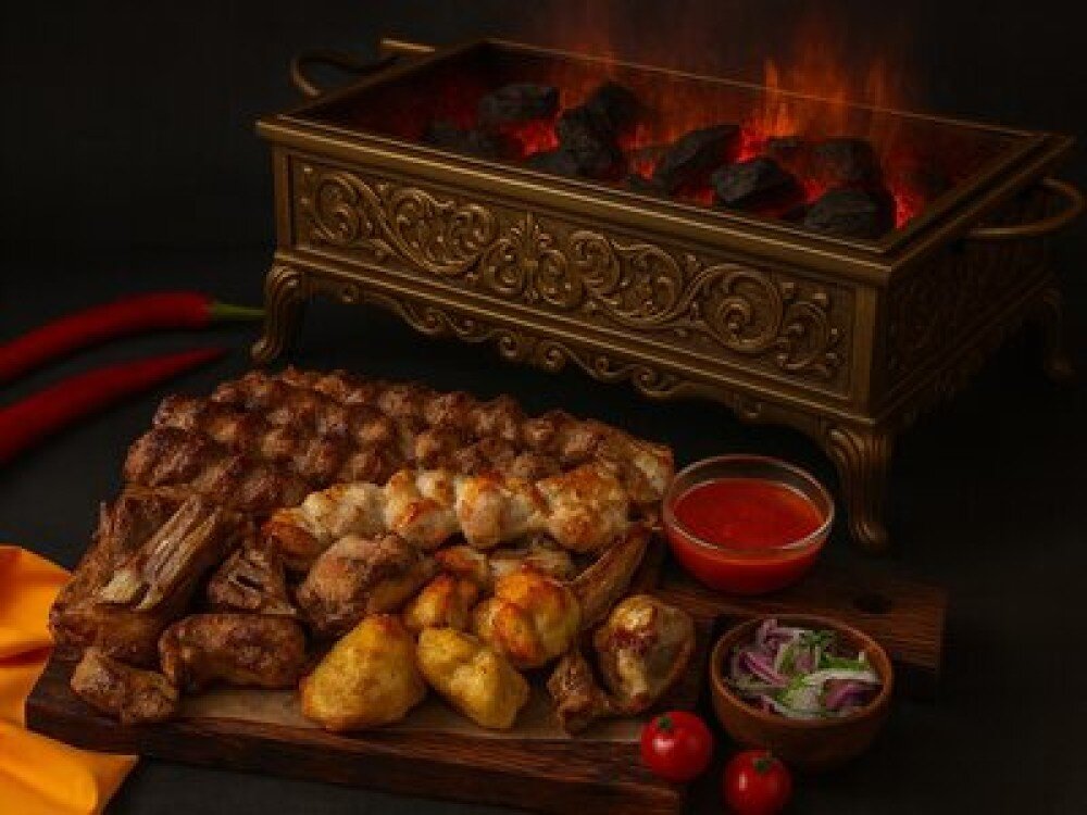 Шейка свиная (560 г), бедро куриное (280 г), грудка куриная (280 г), баранья мякоть (280 г), люля-кебаб из баранины (280 г), люля-кебаб из говядины (280 г), люля-кебаб из курицы (280 г), соус шашлычный (150 г), соус тартар (150 г), лук и зелень (150 г)
