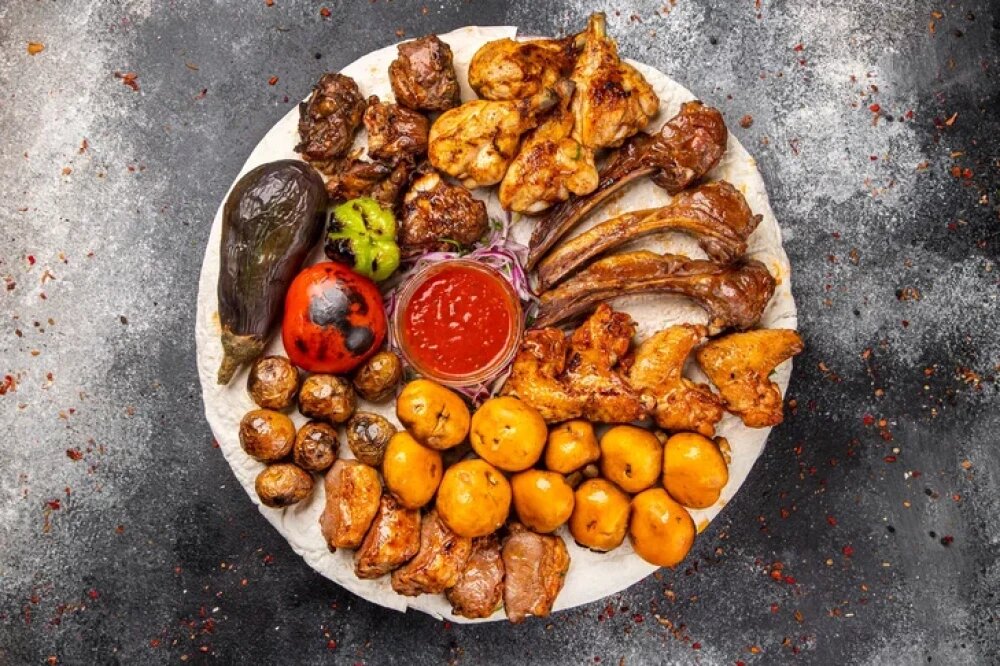 Корейка баранья (300 г), телятина маринованная (280 г), бедро куриное (280 г), шейка свиная (280 г), картофель молодой (300 г), лук и зелень (150 г), соус шашлычный (150 г), соус тартар (150 г)