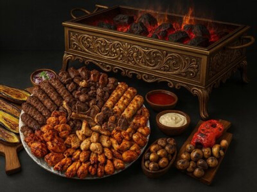 Шейка свиная (540 г), мякоть свиная (540 г), телятина маринованная (540 г), грудка куриная (540 г), бедро куриное (540 г), мякоть баранья (540 г), семечки бараньи (540 г), корейка баранья (640 г), люля-кебаб из говядины (540 г), люля-кебаб из баранины (540 г), люля-кебаб из курицы (540 г), картофель черри (600 г), шампиньоны (500 г), овощной гриль (баклажан, помидор, болгарский перец - 900 г), соус шашлычный (200 г), соус Тартар (200 г), лук и зелень (200 г)